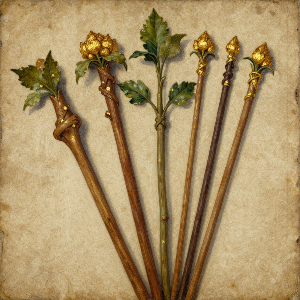 Символ Жезлов — деревянный посох, часто украшенный листьями, почками или пламенем. В эзотерической традиции жезл — это живой ствол, соединяющий землю и небо. Он символизирует рост, силу воли и связь между материальным и духовным. В отличие от холодного металла меча или тяжести пентаклей, жезл лёгок, подвижен и полон жизни.